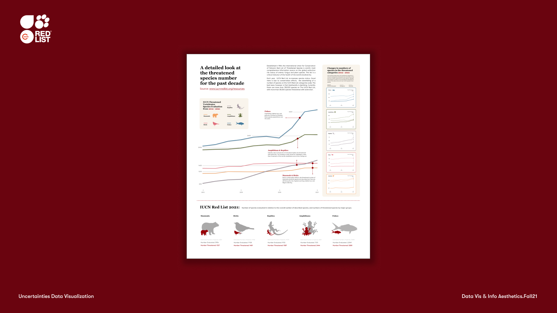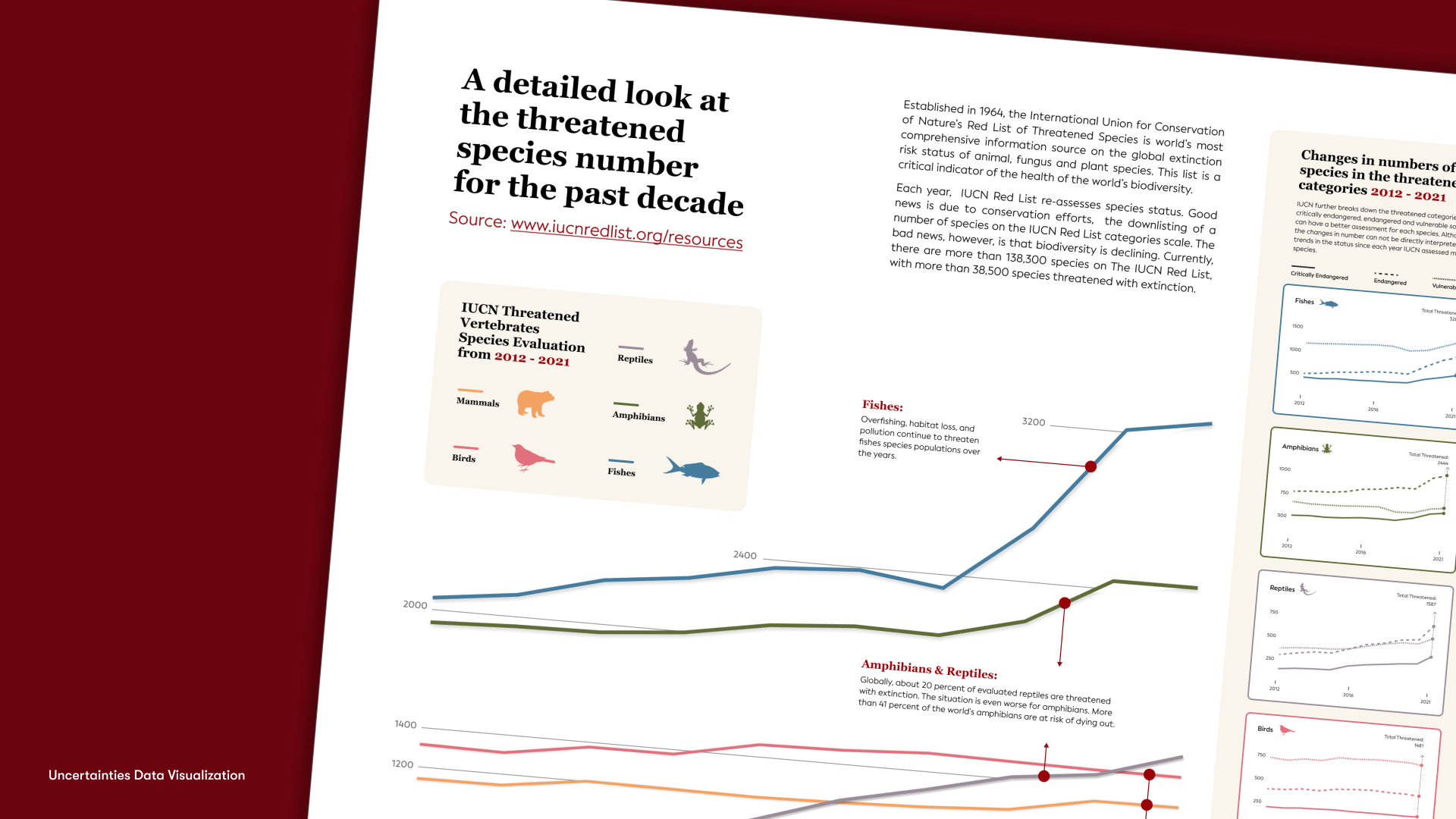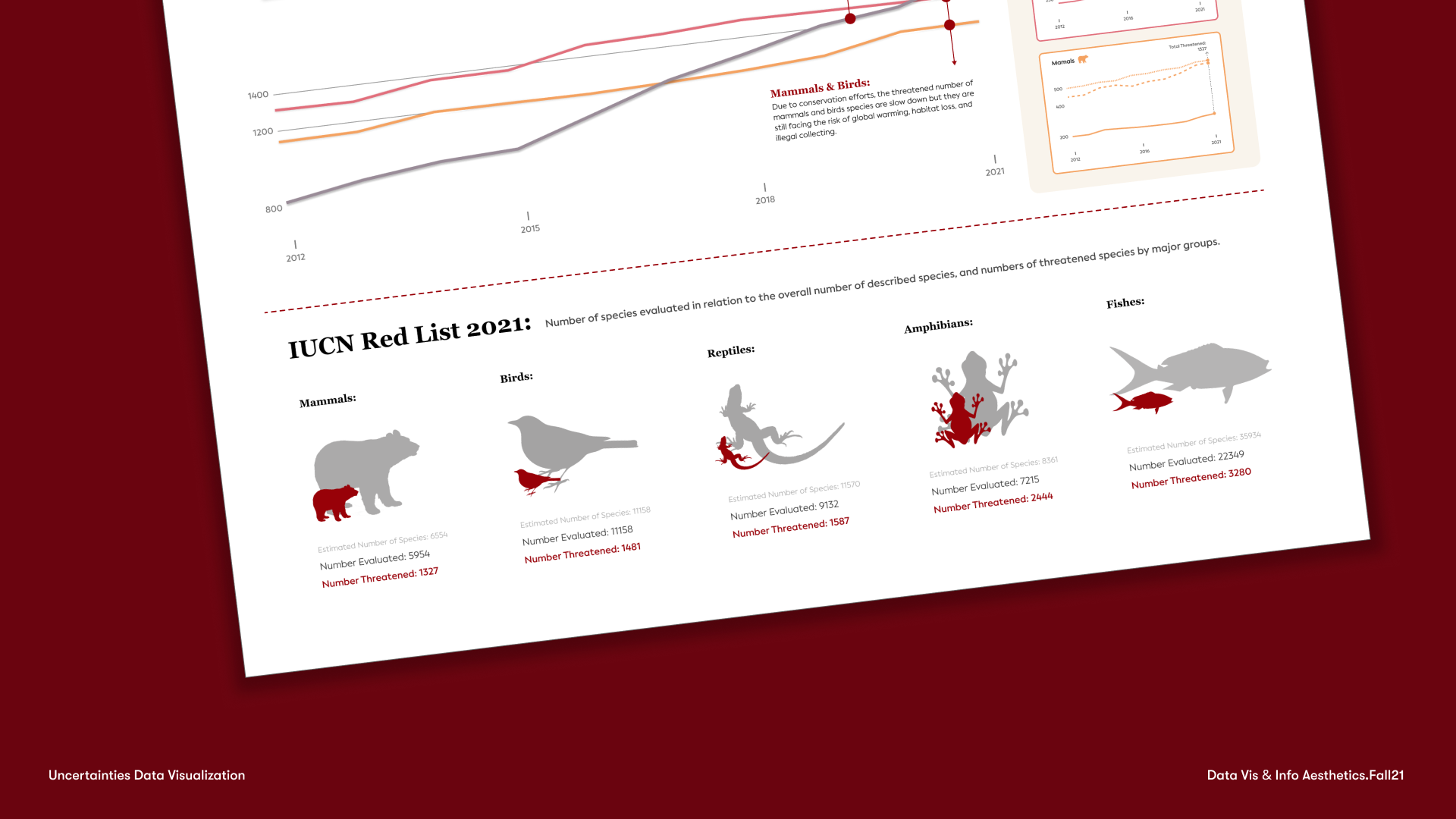 The goal for this project was through visualizing raw datasets to tell a story of “uncertainties”. I chose IUCN red list threatened species as my source datasets to design an infographic data visualization. Through my visualization, I want to express my concerns about the uncertainty of the environment and bring awareness to the audience.