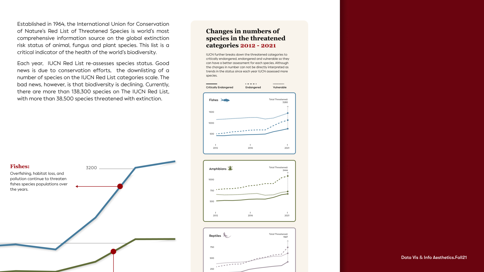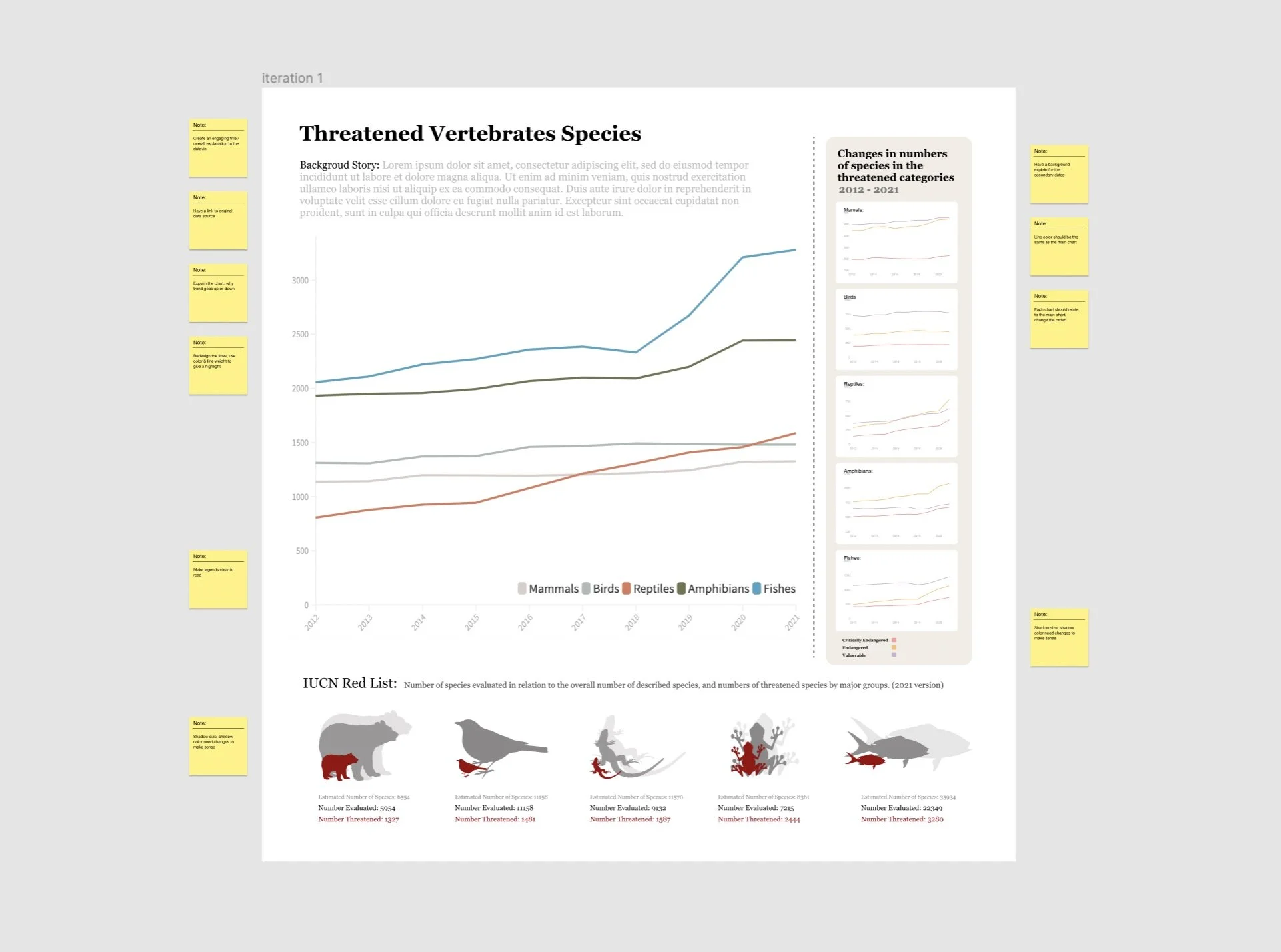 By creating prototypes and using Flourish to process the datasets, I got a better view of the information I want to deliver to audiences through the data visualization. I decide to make an infographic to show the evaluation done by IUCN and what we can learn about the animal population condition for the past decade.