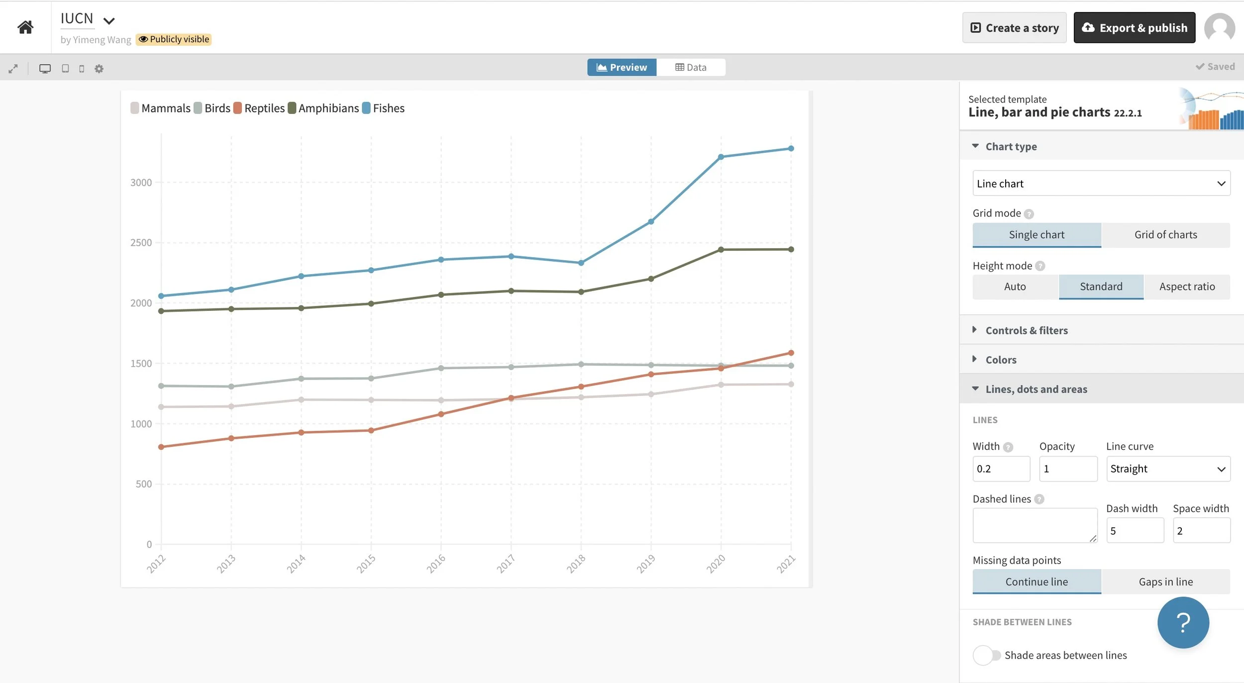 I started the prototyping process by putting the datasets into Flourish to create a line chart. From this line chart, we can see that not all species threatened numbers go higher over the years. This makes me realised that I needed to add in some more context regarding the reasons for the threatened species number increase.