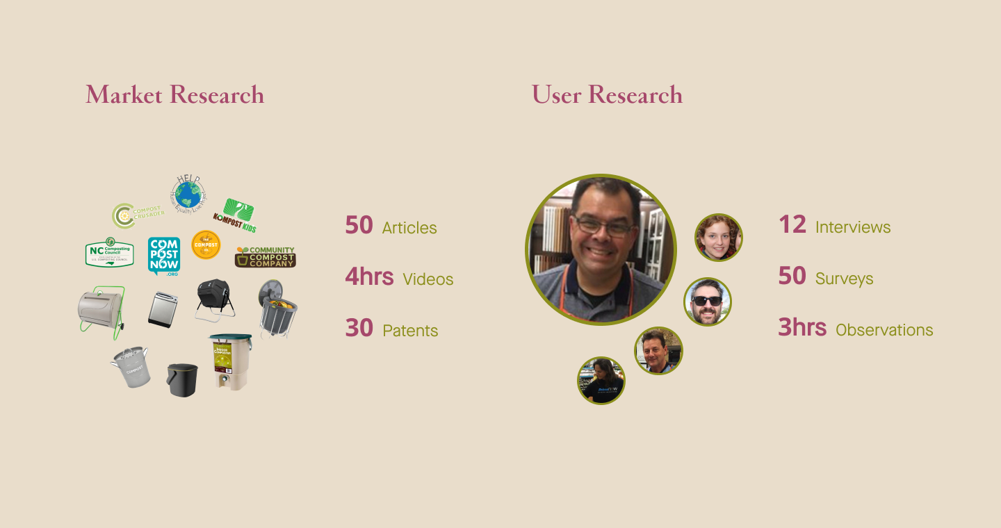 By conducting market research and user research, helps me understand the design opportunities to fulfill the needs of both market and users. Currently, there are many compost services and compost machines in the market but the majority is designed to be used outdoor so people without access to a yard were being left out. There are huge design opportunities for an indoor compost product.