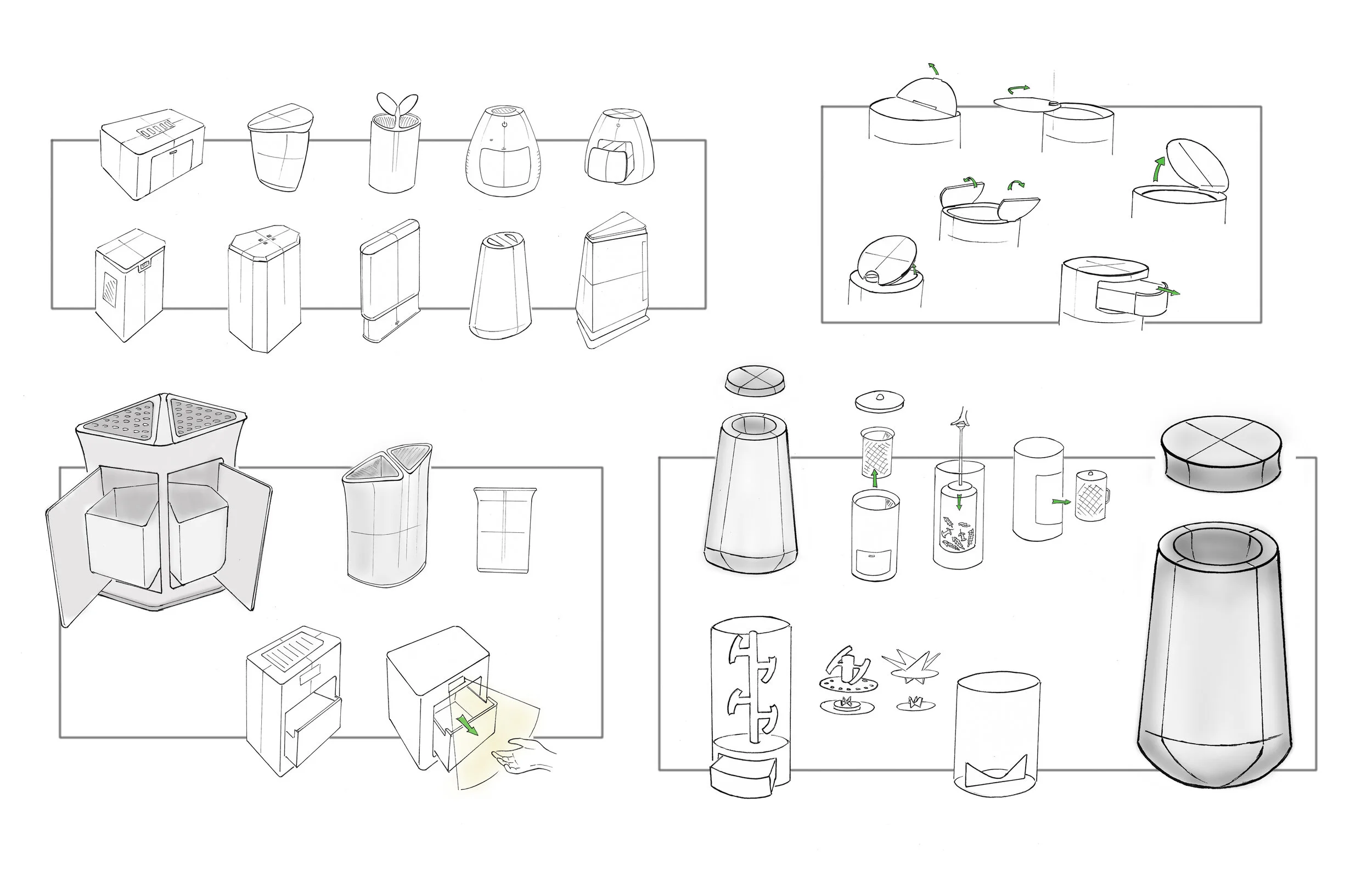Combining the result from research and testing, I decided to design a compact kitchen compost machine to solve the problem. The ideation process focuses on form developing and function developing for the final product.