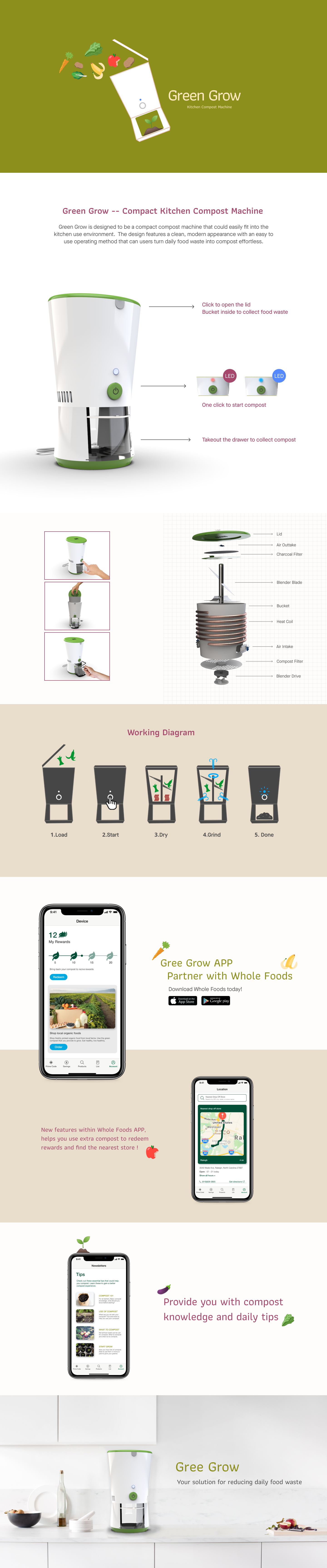 The final outcomes combine a kitchen compost machine, a digital app, and services to create a business model not only benefits the consumer but also helps to build an eco-friendly service system.